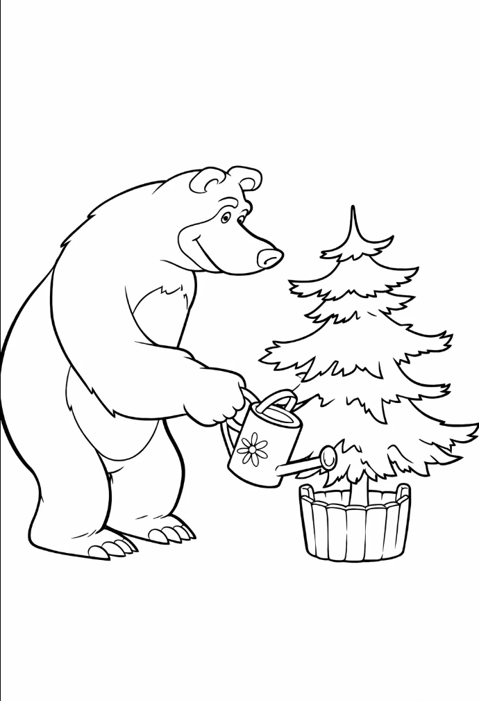Мила та спокійна розфарбовка з популярного мультфільму ідеально підійде для творчого дозвілля дітей. На цьому малюнку розмальовка добрий Ведмідь дбайливо поливає маленьку ялинку, навчаючи турботі про природу та любові до навколишнього світу. Розфарбовка має чіткі лінії та прості форми, завдяки чому підходить для дітей різного віку. Малюнок розмальовка можна розфарбовувати олівцями, фломастерами або фарбами, розвиваючи фантазію, уважність і дрібну моторику. Така розфарбовка стане чудовим варіантом для занять удома, у дитячому садочку або школі. Картинку легко скачати безкоштовно та роздрукувати у форматі А4 для корисного і веселого проведення часу.