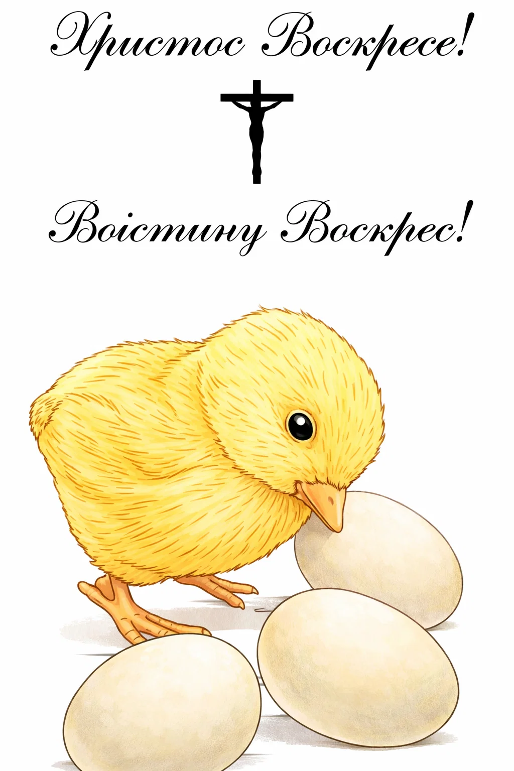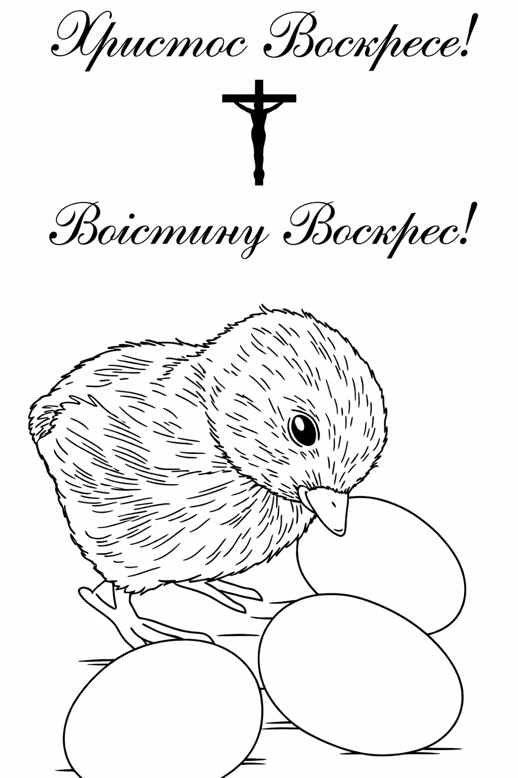 Святкова великодня розфарбовка із милим курчатком і великодніми яйцями стане чудовою ідеєю для творчості дітей і дорослих. На ілюстрації зображене пухнасте курчатко біля писанок та традиційне привітання «Христос Воскрес! Воістину Воскрес!». Детальний малюнок розмальовка допоможе створити яскраву святкову композицію та зробити красиву листівку до Великодня. Така розфарбовка розвиває фантазію, уважність і любов до малювання. Малюнок розмальовка можна легко скачати та роздрукувати в форматі А4 для творчих занять вдома, у школі чи дитячому садку.