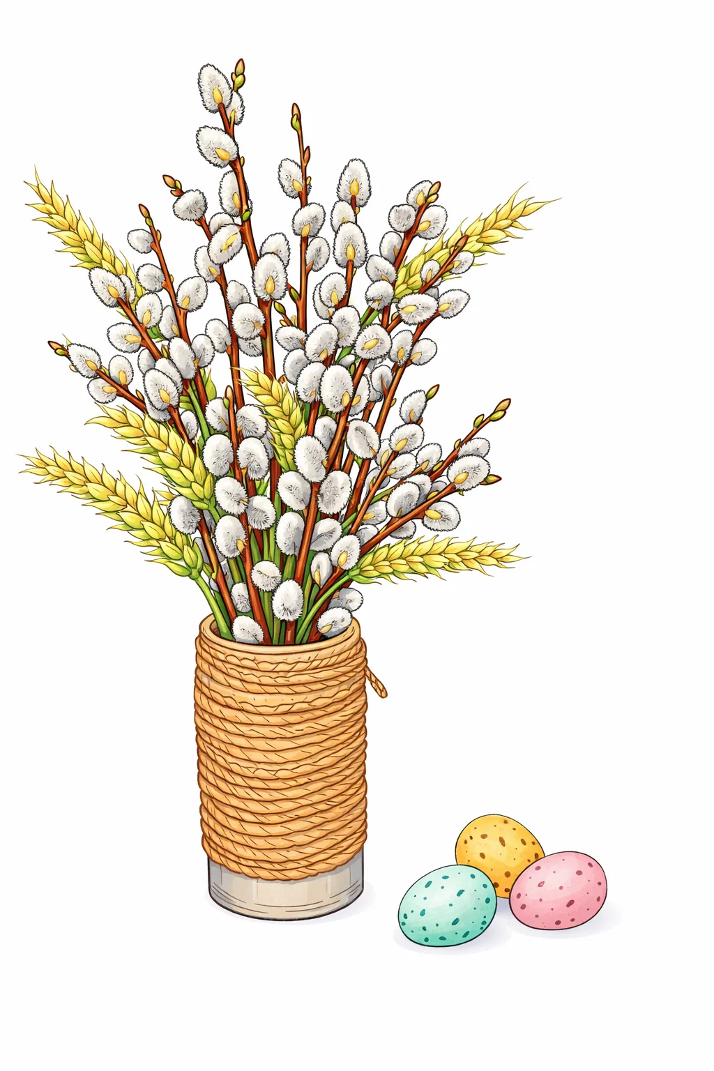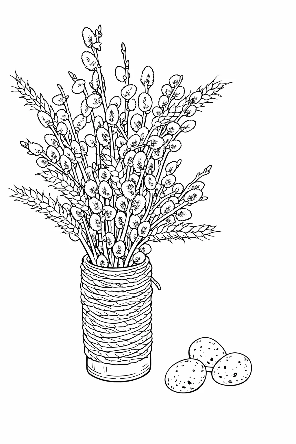 Ця святкова розмальовка до Вербної неділі зображає традиційний букет верби у декоративній вазі та великодні яйця — символи весни, оновлення й духовної чистоти. Деталізований малюнок розмальовка ідеально підходить для творчих занять напередодні свята, допомагає заспокоїтися, розвинути фантазію та уважність. Розфарбовка буде цікава як дітям, так і дорослим, її зручно використовувати для сімейного дозвілля або занять у школі. Малюнок розмальовка легко скачати та роздрукувати у форматі А4 для святкової підготовки.