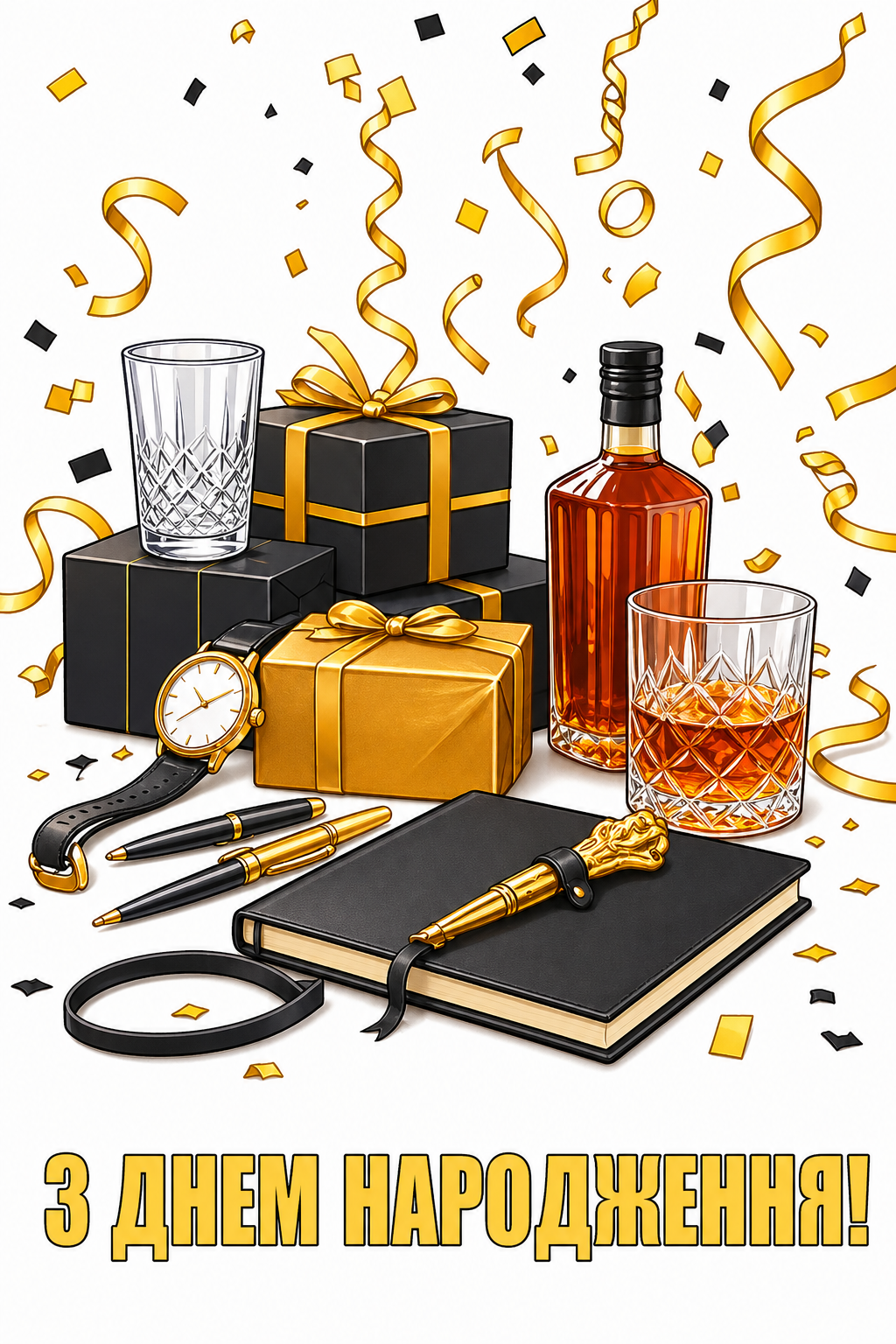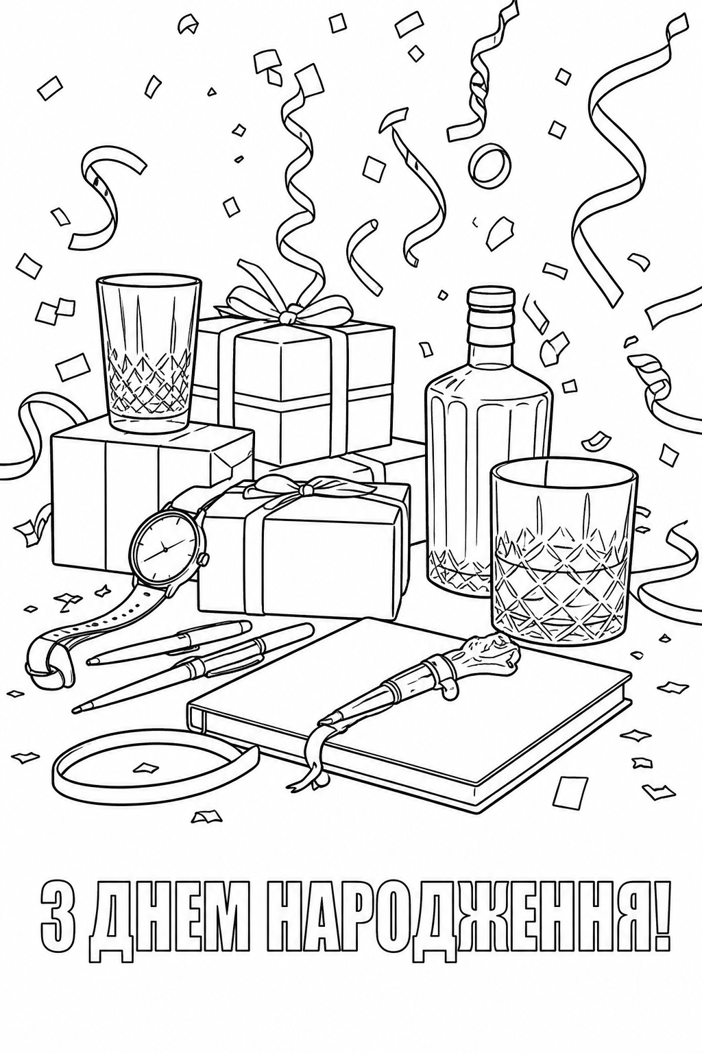 Стильна розфарбовка «Святкова листівка з подарунками для чоловіка» ідеально підходить для створення оригінального привітання. На малюнку розмальовка зображені подарункові коробки, годинник, блокнот, келихи та святкові елементи з написом «З днем народження!». Така розфарбовка допомагає розвивати творчість, уважність і фантазію. Малюнок розмальовка має чіткі деталі, які цікаво розфарбовувати олівцями чи фломастерами. Ви можете скачати розфарбовку та роздрукувати у форматі А4, щоб створити унікальну святкову листівку своїми руками.