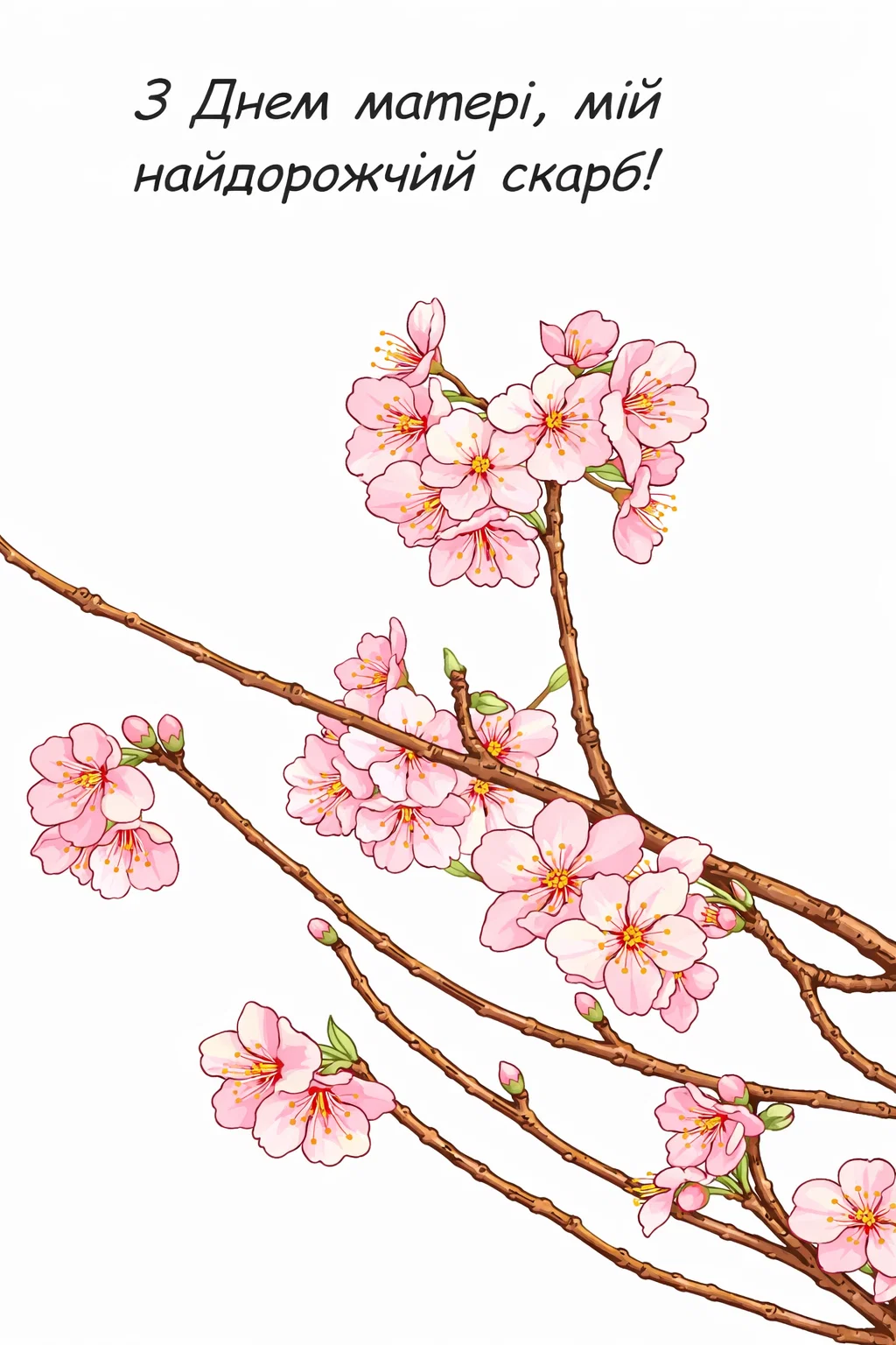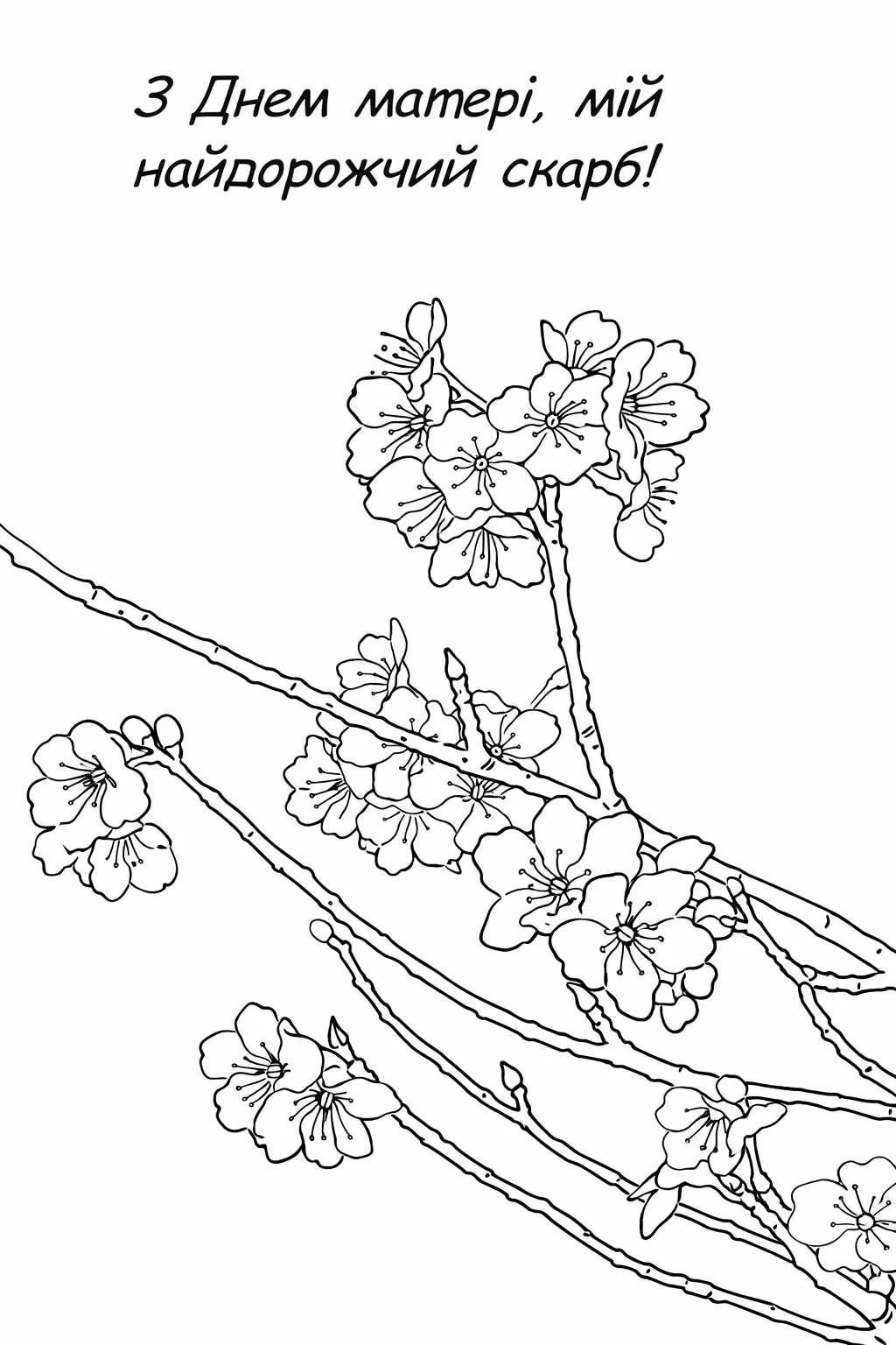 Ніжна святкова розфарбовка до Дня матері із зображенням квітучої гілки та теплим написом «З Днем матері, мій найдорожчий скарб!» стане чудовою ідеєю для вітальної листівки. Такий малюнок розмальовка можна розфарбувати у ніжні весняні кольори, створивши красивий подарунок для мами. Розфарбовка допомагає дітям проявити любов і турботу, а також розвиває творче мислення, фантазію та дрібну моторику. Малюнок розмальовка підходить для занять у школі, дитячому садку або вдома. Її легко скачати та роздрукувати у форматі А4, щоб створити особливу святкову листівку власними руками.