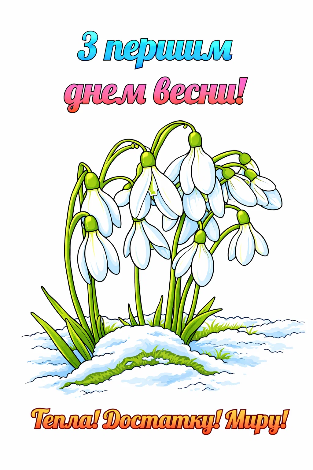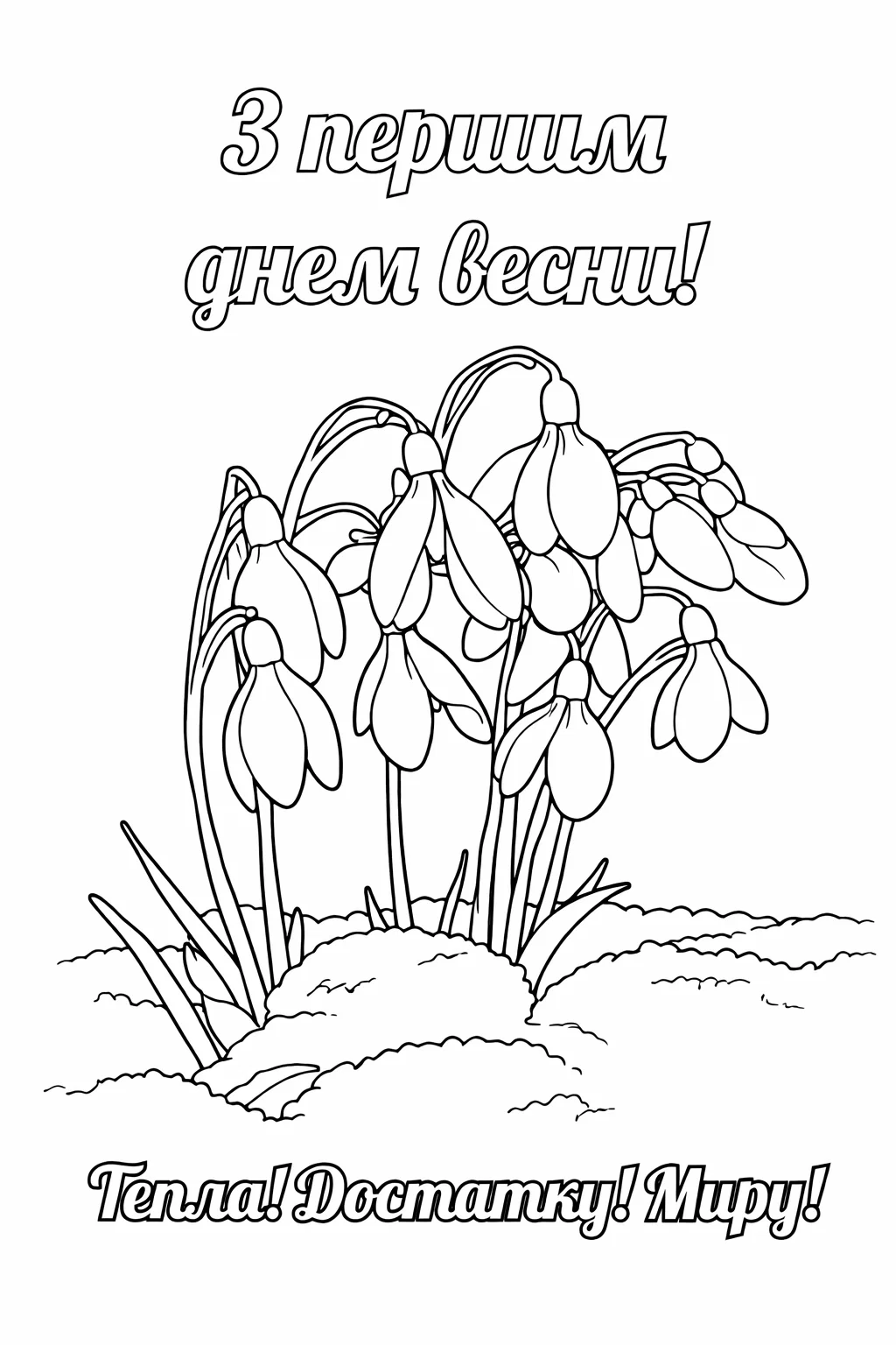 Ця весняна розмальовка з серії «Пори року» присвячена першому дню весни та пробудженню природи. На малюнку зображені ніжні проліски, що визирають із-під снігу, та святкові слова «З першим днем весни! Тепла! Достатку! Миру!», які створюють світлий і натхненний настрій. Розфарбовка ідеально підходить для дітей і дорослих, допомагає розслабитися, зосередитися й відчути радість приходу тепла. Малюнок розмальовка має чіткі контури, зручні для розфарбовування олівцями, фломастерами або фарбами. Така розфарбовка чудово підійде для занять удома, у школі чи дитячому садку та легко друкується у форматі А4.